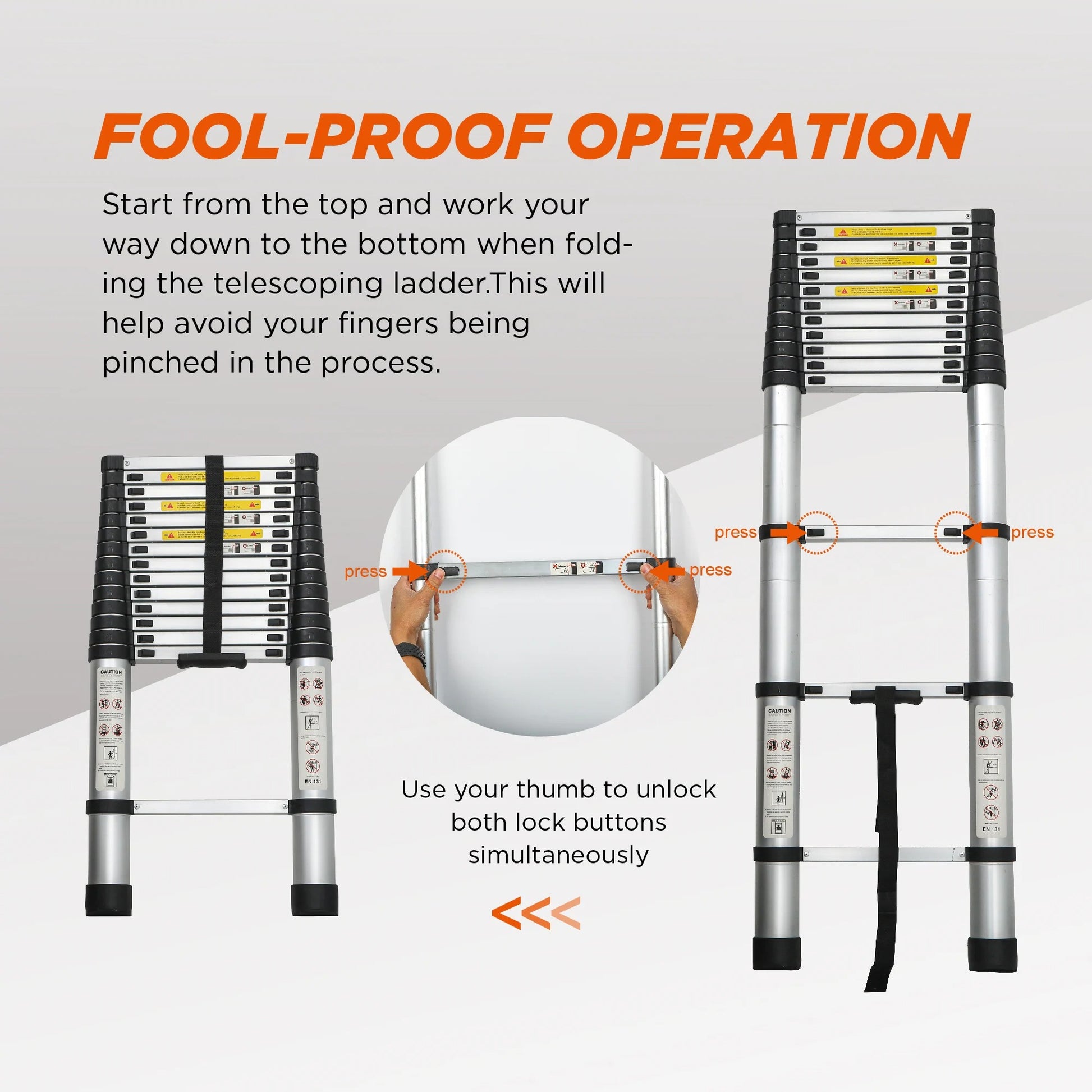 - One Button Retraction: Are you tired of restrictions? Get ready for a compact size you can trust! The telescoping extension ladder can be retracted at any length. There is no need to retract components separately, saving you time. Press the thumb button, and it will automatically descend at a smooth and slow speed, ensuring that your fingers will not be pinched. It is so convenient to operate.